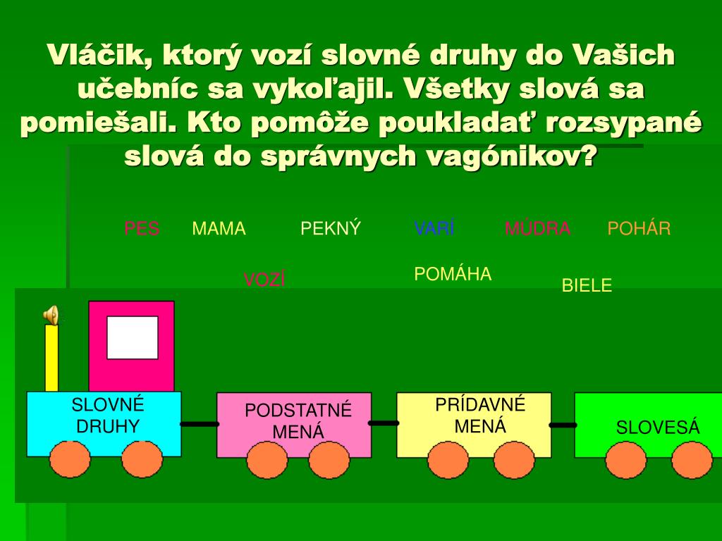 Vláčik, ktorý vozí slovné druhy do Vašich učebníc sa vykoľajil. Všetky slová sa pomiešali. Kto pomôže poukladať rozsypané slová do správnych vagónikov? PES MAMA PEKNÝ VARÍ MÚDRA POHÁR POMÁHA VOZÍ BIELE SLOVNÉ DRUHY PRÍDAVNÉ MENÁ PODSTATNÉ MENÁ SLOVESÁ