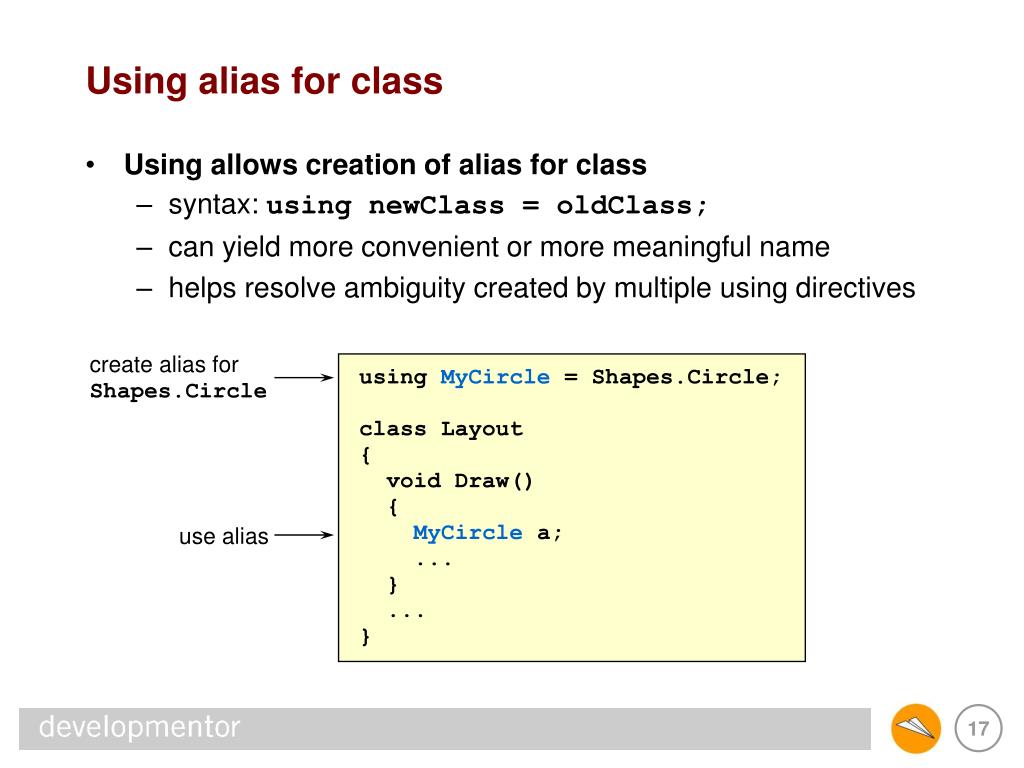 Using alias for class • Using allows creation of alias for class • syntax: using newClass = oldClass; • can yield more convenient or more meaningful name • helps resolve ambiguity created by multiple using directives create alias for Shapes.Circle using MyCircle = Shapes.Circle; class Layout { void Draw() { MyCircle a; ... } ... } use alias