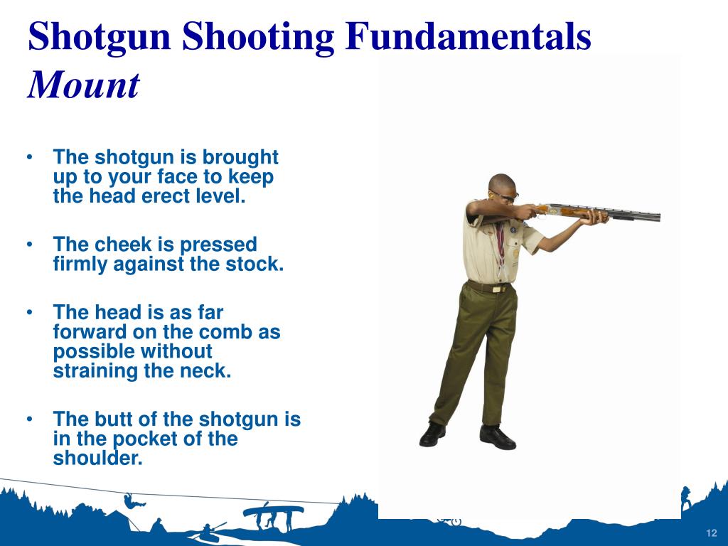 The shotgun is brought up to your face to keep the head erect level. The cheek is pressed firmly against the stock. The head is as far forward on the comb as possible without straining the neck. The butt of the shotgun is in the pocket of the shoulder. Shotgun Shooting FundamentalsMount
