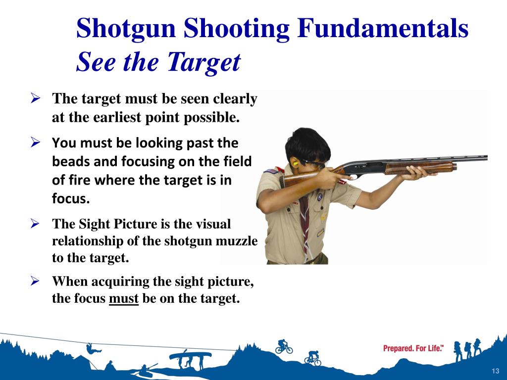 Shotgun Shooting Fundamentals See the Target • The target must be seen clearly at the earliest point possible. • You must be looking past the beads and focusing on the field of fire where the target is in focus. • The Sight Picture is the visual relationship of the shotgun muzzle to the target. • When acquiring the sight picture, the focus must be on the target.
