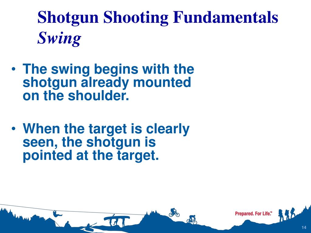 The swing begins with the shotgun already mounted on the shoulder. When the target is clearly seen, the shotgun is pointed at the target. Shotgun Shooting Fundamentals Swing