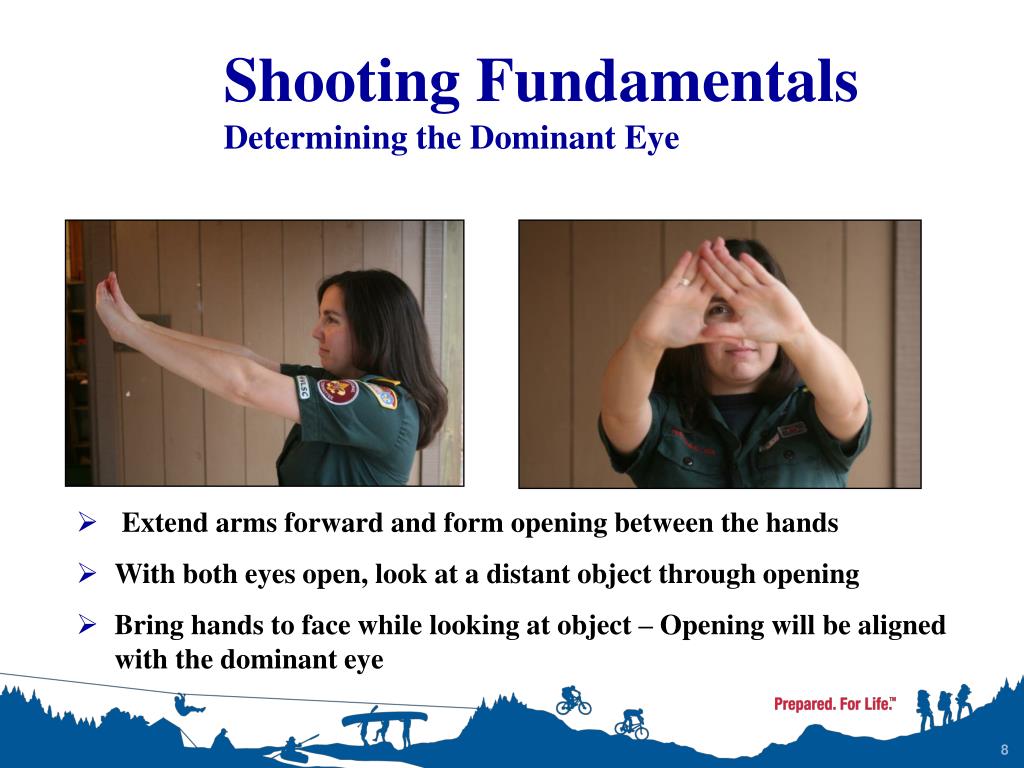Shooting FundamentalsDetermining the Dominant Eye • Extend arms forward and form opening between the hands • With both eyes open, look at a distant object through opening • Bring hands to face while looking at object – Opening will be aligned with the dominant eye