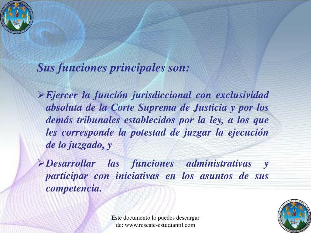Sus funciones principales son: • Ejercer la función jurisdiccional con exclusividad absoluta de la Corte Suprema de Justicia y por los demás tribunales establecidos por la ley, a los que les corresponde la potestad de juzgar la ejecución de lo juzgado, y • Desarrollar las funciones administrativas y participar con iniciativas en los asuntos de sus competencia. Este documento lo puedes descargar de: www.rescate-estudiantil.com