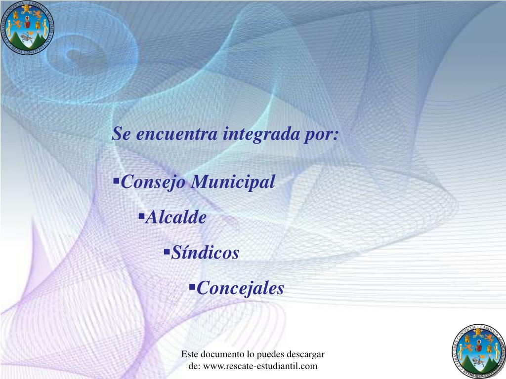 Se encuentra integrada por: • Consejo Municipal • Alcalde • Síndicos • Concejales Este documento lo puedes descargar de: www.rescate-estudiantil.com