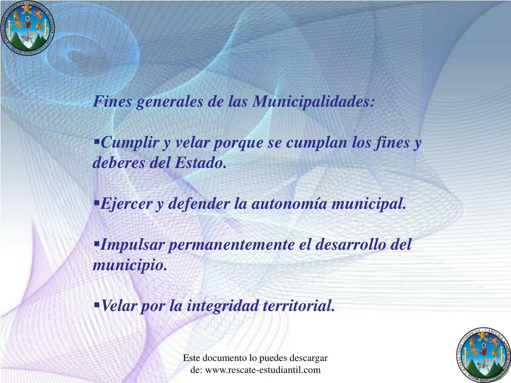 Fines generales de las Municipalidades: • Cumplir y velar porque se cumplan los fines y deberes del Estado. • Ejercer y defender la autonomía municipal. • Impulsar permanentemente el desarrollo del municipio. • Velar por la integridad territorial. Este documento lo puedes descargar de: www.rescate-estudiantil.com