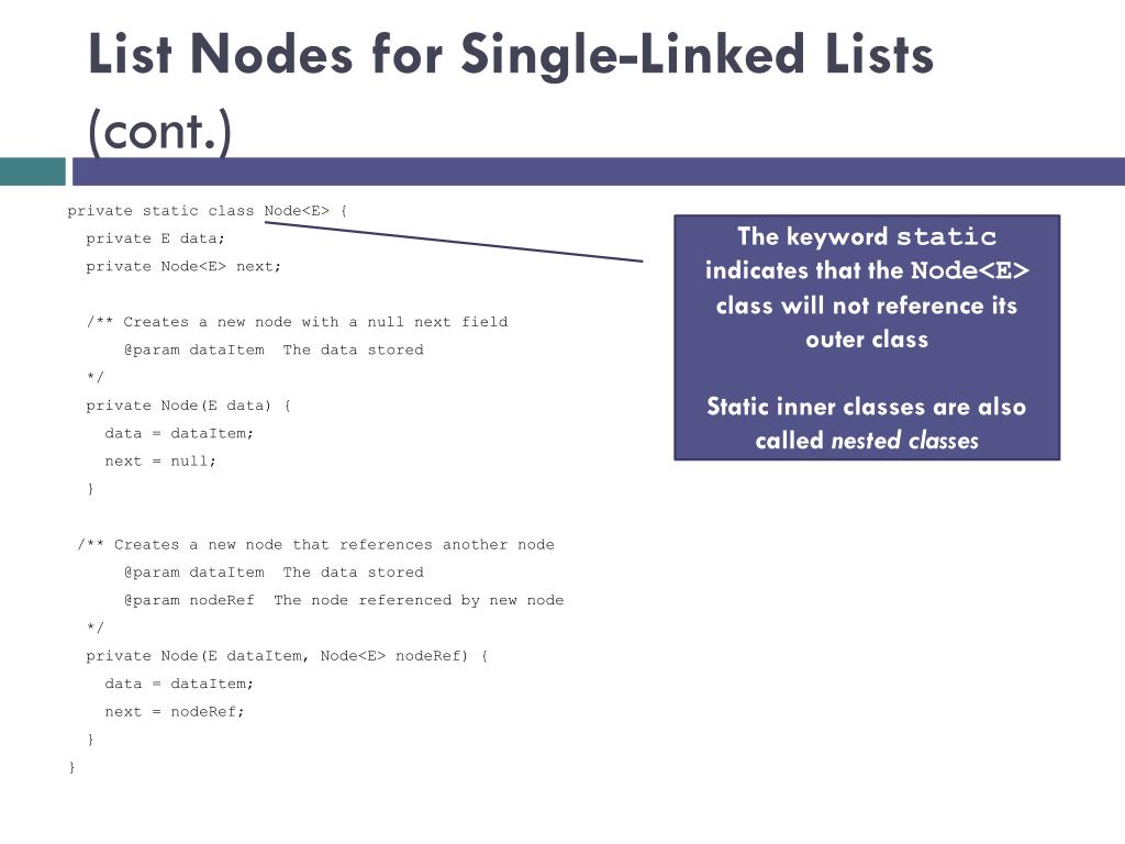 List Nodes for Single-Linked Lists (cont.) private static class Node<E> { private E data; private Node<E> next; /** Creates a new node with a null next field @param dataItem The data stored */ private Node(E data) { data = dataItem; next = null; } /** Creates a new node that references another node @param dataItem The data stored @param nodeRef The node referenced by new node */ private Node(E dataItem, Node<E> nodeRef) { data = dataItem; next = nodeRef; } } The keyword static indicates that the Node<E> class will not reference its outer class Static inner classes are also called nested classes