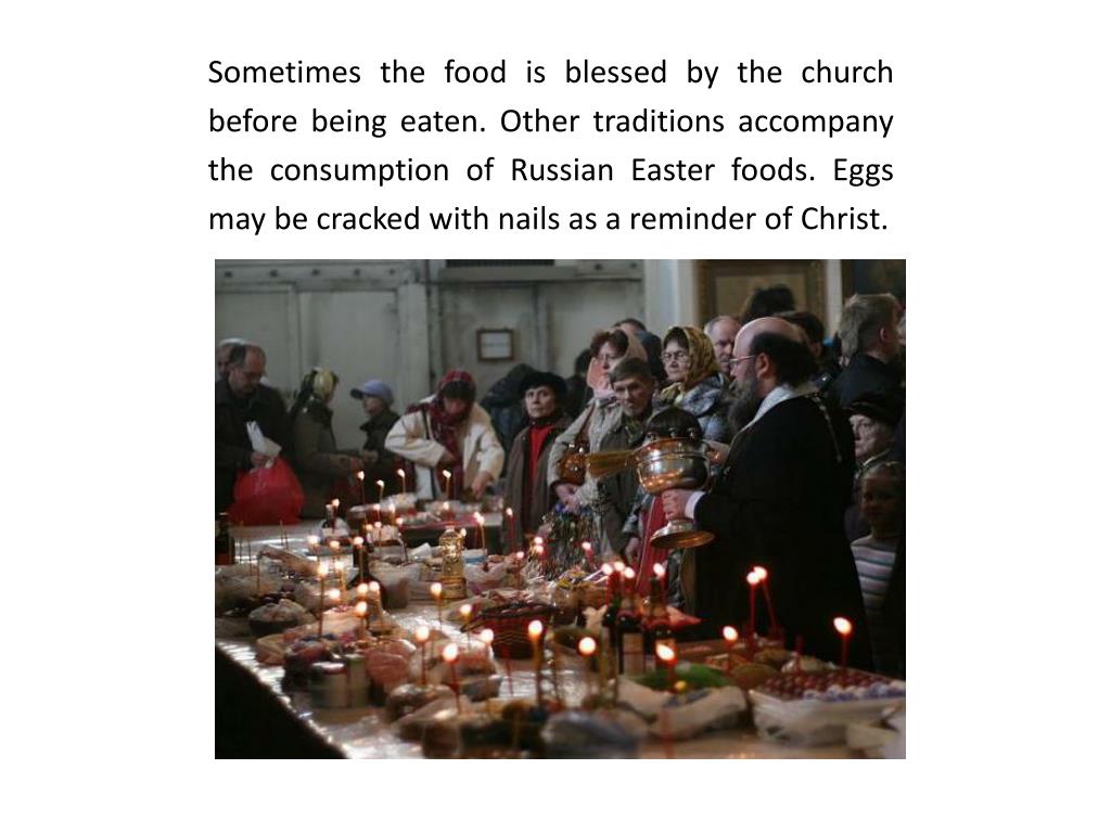 Sometimes the food is blessed by the church before being eaten. Other traditions accompany the consumption of Russian Easter foods. Eggs may be cracked with nails as a reminder of Christ.