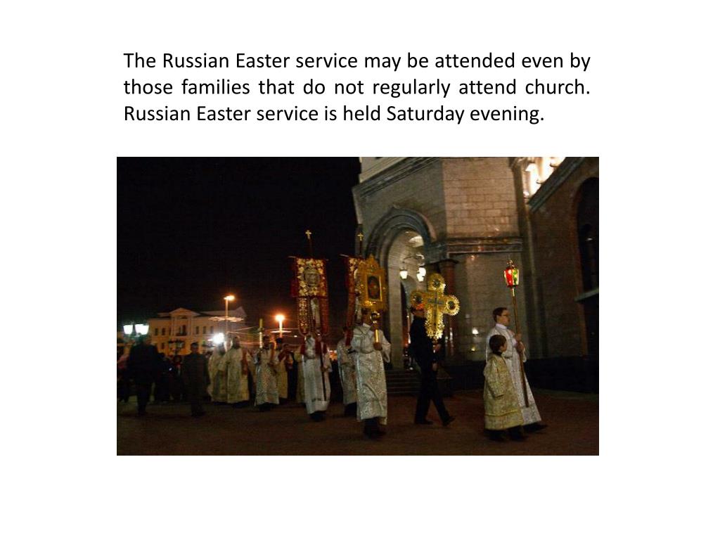 The Russian Easter service may be attended even by those families that do not regularly attend church. Russian Easter service is held Saturday evening.