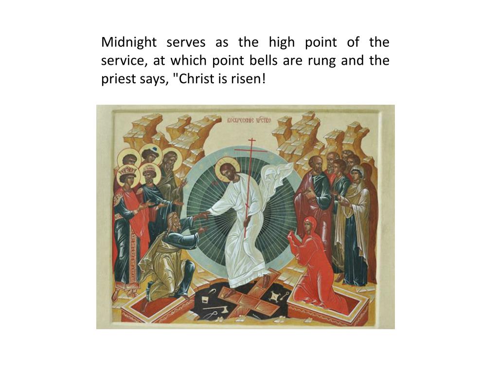 Midnight serves as the high point of the service, at which point bells are rung and the priest says, "Christ is risen!