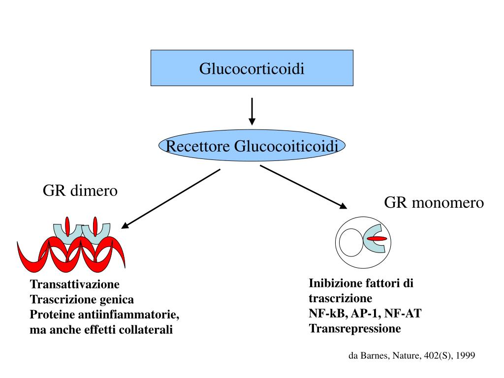 Glucocorticoidi Recettore Glucocoiticoidi GR dimero GR monomero Inibizione fattori di trascrizione NF-kB, AP-1, NF-AT Transrepressione Transattivazione Trascrizione genica Proteine antiinfiammatorie, ma anche effetti collaterali da Barnes, Nature, 402(S), 1999