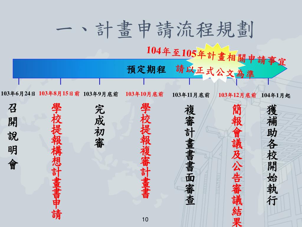 一、計畫申請流程規劃 104年至105年計畫相關申請事宜 請以正式公文為準 預定期程 103年8月15日前 103年6月24日 103年9月底前 103年10月底前 103年11月底前 103年12月底前 104年1月起 召開說明會 學校提報構想計畫書申請 學校提報複審計畫書 完成初審 複審計畫書書面審查 簡報會議及公告審議結果 獲補助各校開始執行 10