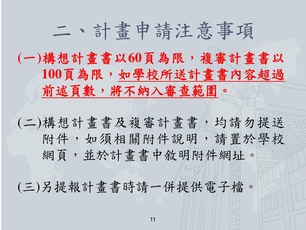 二、計畫申請注意事項 (一)構想計畫書以60頁為限,複審計畫書以 100頁為限,如學校所送計畫書內容超過前述頁數,將不納入審查範圍。 (二)構想計畫書及複審計畫書,均請勿提送 附件,如須相關附件說明,請置於學校 網頁,並於計畫書中敘明附件網址。 (三)另提報計畫書時請一併提供電子檔。 11