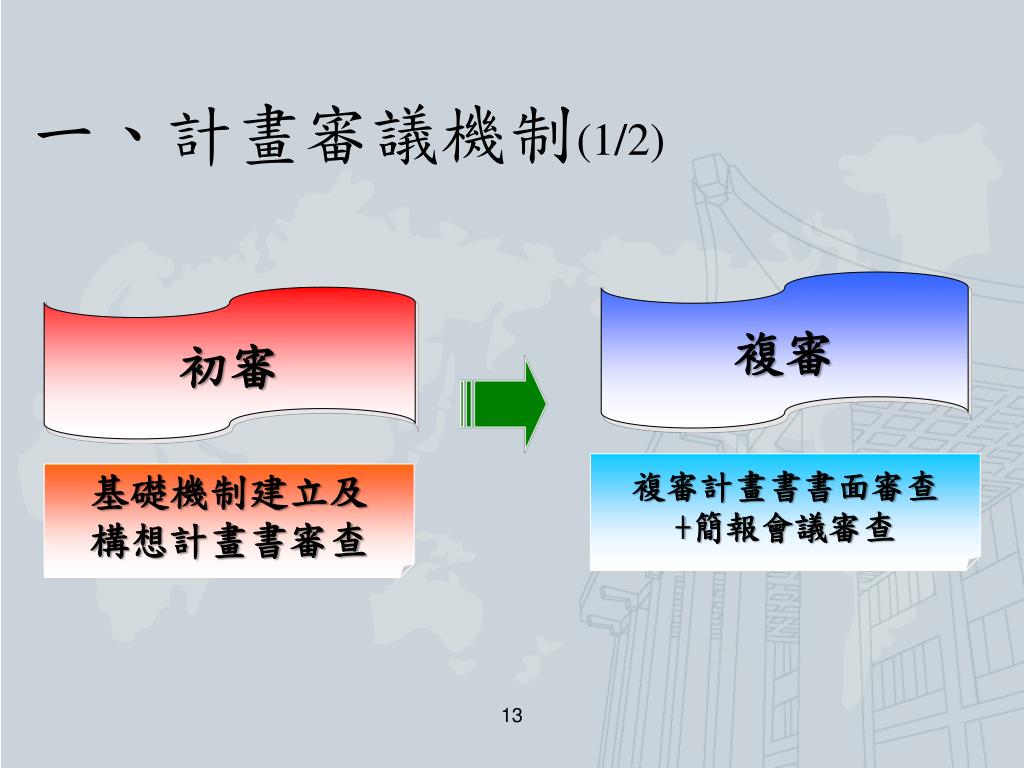 初審 複審 基礎機制建立及 構想計畫書審查 複審計畫書書面審查 +簡報會議審查 一、計畫審議機制(1/2) 13