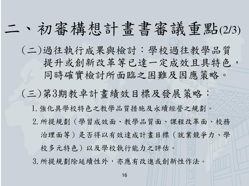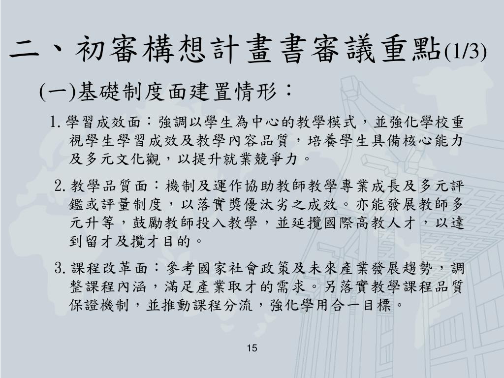 二、初審構想計畫書審議重點(1/3) (一)基礎制度面建置情形: 1.學習成效面:強調以學生為中心的教學模式,並強化學校重視學生學習成效及教學內容品質,培養學生具備核心能力及多元文化觀,以提升就業競爭力。 2.教學品質面:機制及運作協助教師教學專業成長及多元評鑑或評量制度,以落實獎優汰劣之成效。亦能發展教師多元升等,鼓勵教師投入教學,並延攬國際高教人才,以達到留才及攬才目的。 3.課程改革面:參考國家社會政策及未來產業發展趨勢,調整課程內涵,滿足產業取才的需求。另落實教學課程品質保證機制,並推動課程分流,強化學用合一目標。 15