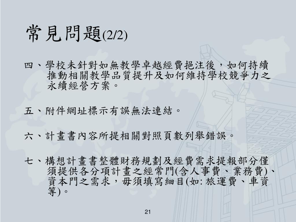常見問題(1/2) 一、計畫內容應避免以長年推動的常態性作法為主。如為深化前期計畫之重要方案,除延續性之外,應有改進或創新性作為。 二、學校呈現之具體成效,大多是辦幾場活動、多少人次參加等,建議學校應降低 辦理短期性活動之「產出型」(output)指標,而著重於「學生能力加值表現」。 三、計畫書內容應整合學校之整體發展架構而非各單位分別之重點。 20