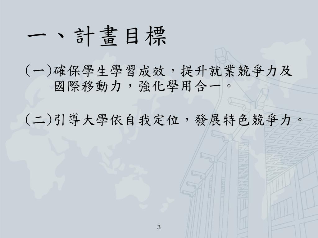 一、計畫目標 (一)確保學生學習成效,提升就業競爭力及國際移動力,強化學用合一。 (二)引導大學依自我定位,發展特色競爭力。 3