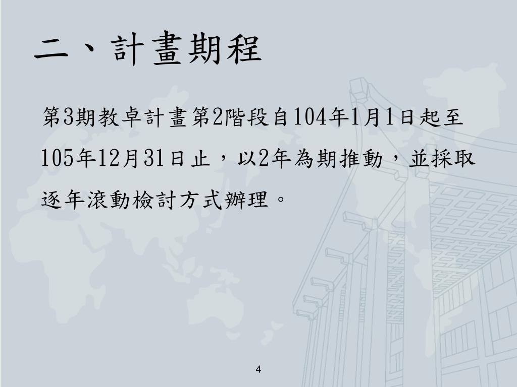 二、計畫期程 第3期教卓計畫第2階段自104年1月1日起至105年12月31日止,以2年為期推動,並採取逐年滾動檢討方式辦理。 4