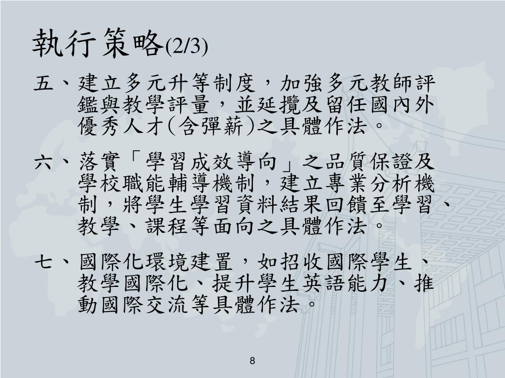 執行策略(2/3) 五、建立多元升等制度,加強多元教師評鑑與教學評量,並延攬及留任國內外優秀人才(含彈薪)之具體作法。 六、落實「學習成效導向」之品質保證及學校職能輔導機制,建立專業分析機制,將學生學習資料結果回饋至學習、教學、課程等面向之具體作法。 七、國際化環境建置,如招收國際學生、教學國際化、提升學生英語能力、推動國際交流等具體作法。 8
