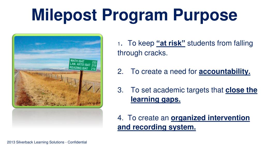 2013 Silverback Learning Solutions - Confidential Milepost Program Purpose • 1. To keep “at risk”students from falling through cracks. • To create a need for accountability. • To set academic targets that close the learning gaps. • 4. To create an organized intervention and recording system.