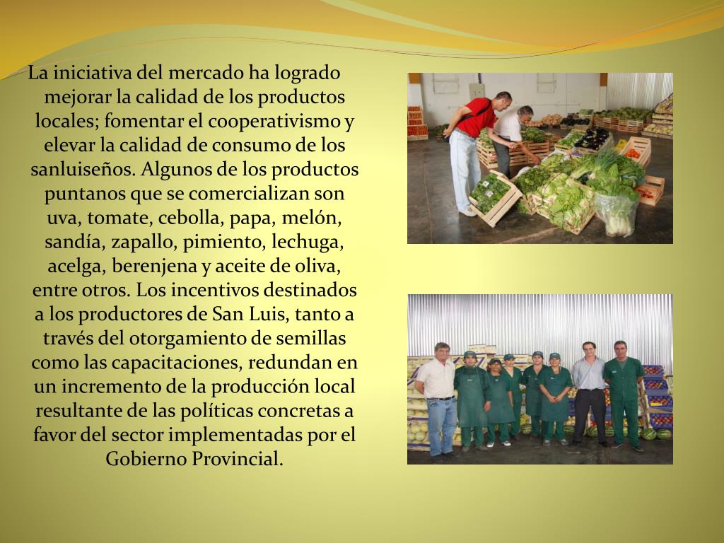 La iniciativa del mercado ha logrado mejorar la calidad de los productos locales; fomentar el cooperativismo y elevar la calidad de consumo de los sanluiseños. Algunos de los productos puntanos que se comercializan son uva, tomate, cebolla, papa, melón, sandía, zapallo, pimiento, lechuga, acelga, berenjena y aceite de oliva, entre otros. Los incentivos destinados a los productores de San Luis, tanto a través del otorgamiento de semillas como las capacitaciones, redundan en un incremento de la producción local resultante de las políticas concretas a favor del sector implementadas por el Gobierno Provincial.