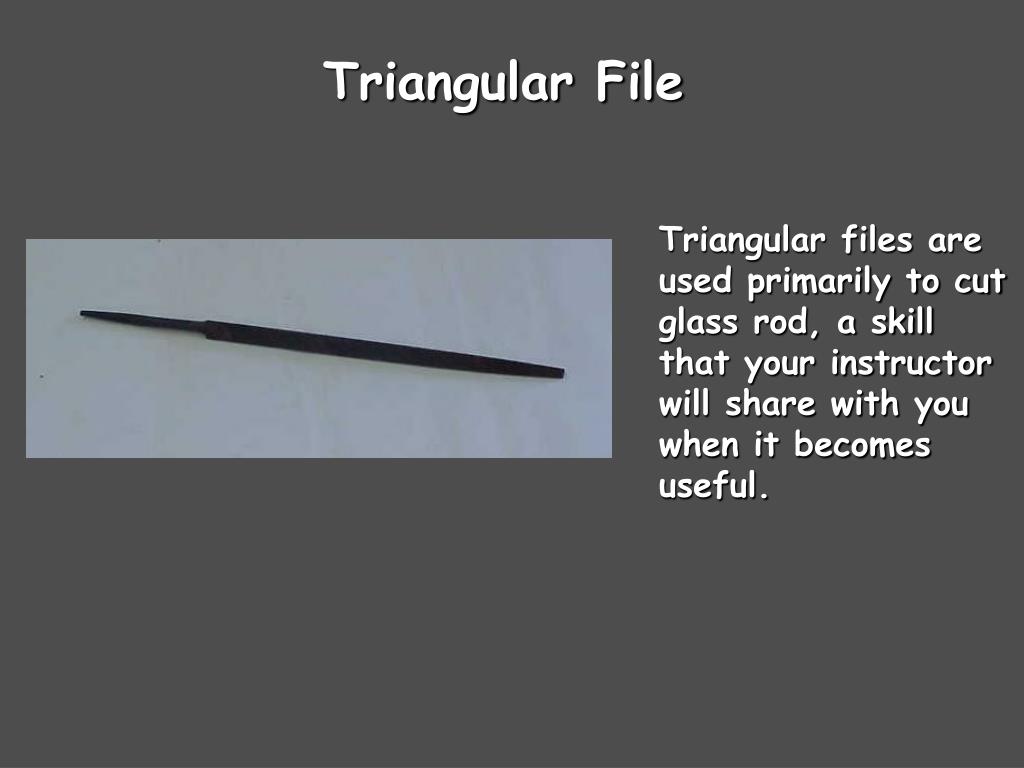Triangular File Triangular files are used primarily to cut glass rod, a skill that your instructor will share with you when it becomes useful.