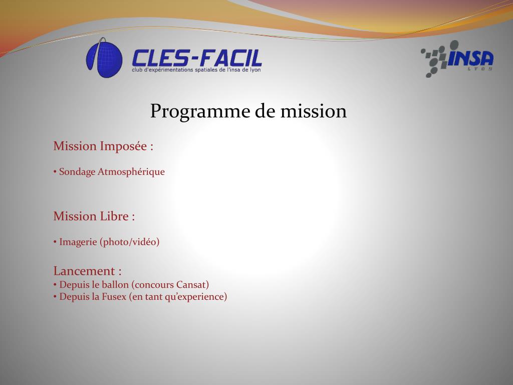 Programme de mission • Mission Imposée : • Sondage Atmosphérique • Mission Libre : • Imagerie (photo/vidéo) • Lancement : • Depuis le ballon (concoursCansat) • Depuis la Fusex (en tantqu’experience)