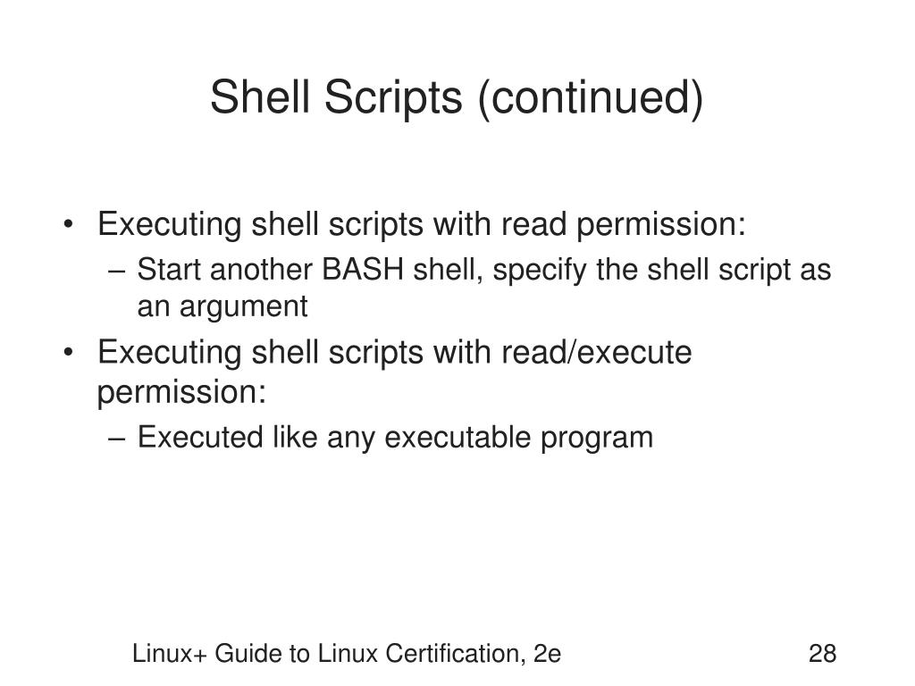 Shell Scripts (continued) • Executing shell scripts with read permission: • Start another BASH shell, specify the shell script as an argument • Executing shell scripts with read/execute permission: • Executed like any executable program Linux+ Guide to Linux Certification, 2e