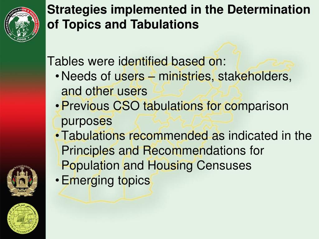 Strategies implemented in the Determination of Topics and Tabulations • Tables were identified based on: • Needs of users – ministries, stakeholders, and other users • Previous CSO tabulations for comparison purposes • Tabulations recommended as indicated in the Principles and Recommendations for Population and Housing Censuses • Emerging topics