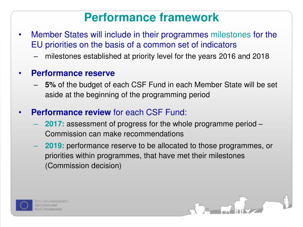 Performance framework • Member States will include in their programmes milestones for the EU priorities on the basis of a common set of indicators • milestones established at priority level for the years 2016 and 2018 • Performance reserve • 5%of the budget of each CSF Fund in each Member State will be set aside at the beginning of the programming period • Performance review for each CSF Fund: • 2017: assessment of progress for the whole programme period – Commission can make recommendations • 2019: performance reserve to be allocated to those programmes, or priorities within programmes, that have met their milestones (Commission decision)
