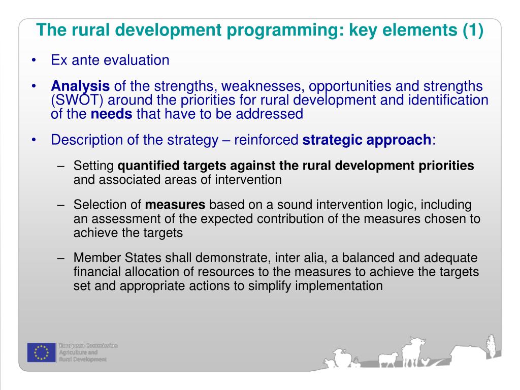 The rural development programming: key elements (1) • Ex ante evaluation • Analysis of the strengths, weaknesses, opportunities and strengths (SWOT) around the priorities for rural development and identification of the needs that have to be addressed • Description of the strategy – reinforced strategic approach: • Setting quantified targetsagainst the rural development priorities and associated areas of intervention • Selection of measures based on a sound intervention logic, including an assessment of the expected contribution of the measures chosen to achieve the targets • Member States shall demonstrate, inter alia, a balanced and adequate financial allocation of resources to the measures to achieve the targets set and appropriate actions to simplify implementation