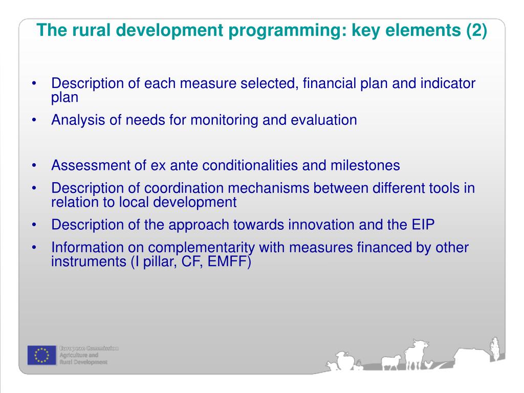 The rural development programming: key elements (2) • Description of each measure selected, financial plan and indicator plan • Analysis of needs for monitoring and evaluation • Assessment of ex ante conditionalities and milestones • Description of coordination mechanisms between different tools in relation to local development • Description of the approach towards innovation and the EIP • Information on complementarity with measures financed by other instruments (I pillar, CF, EMFF)