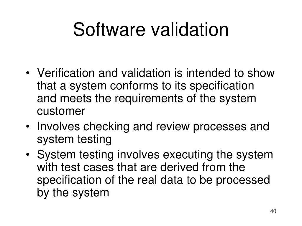 Software validation • Verification and validation is intended to show that a system conforms to its specification and meets the requirements of the system customer • Involves checking and review processes and system testing • System testing involves executing the system with test cases that are derived from the specification of the real data to be processed by the system