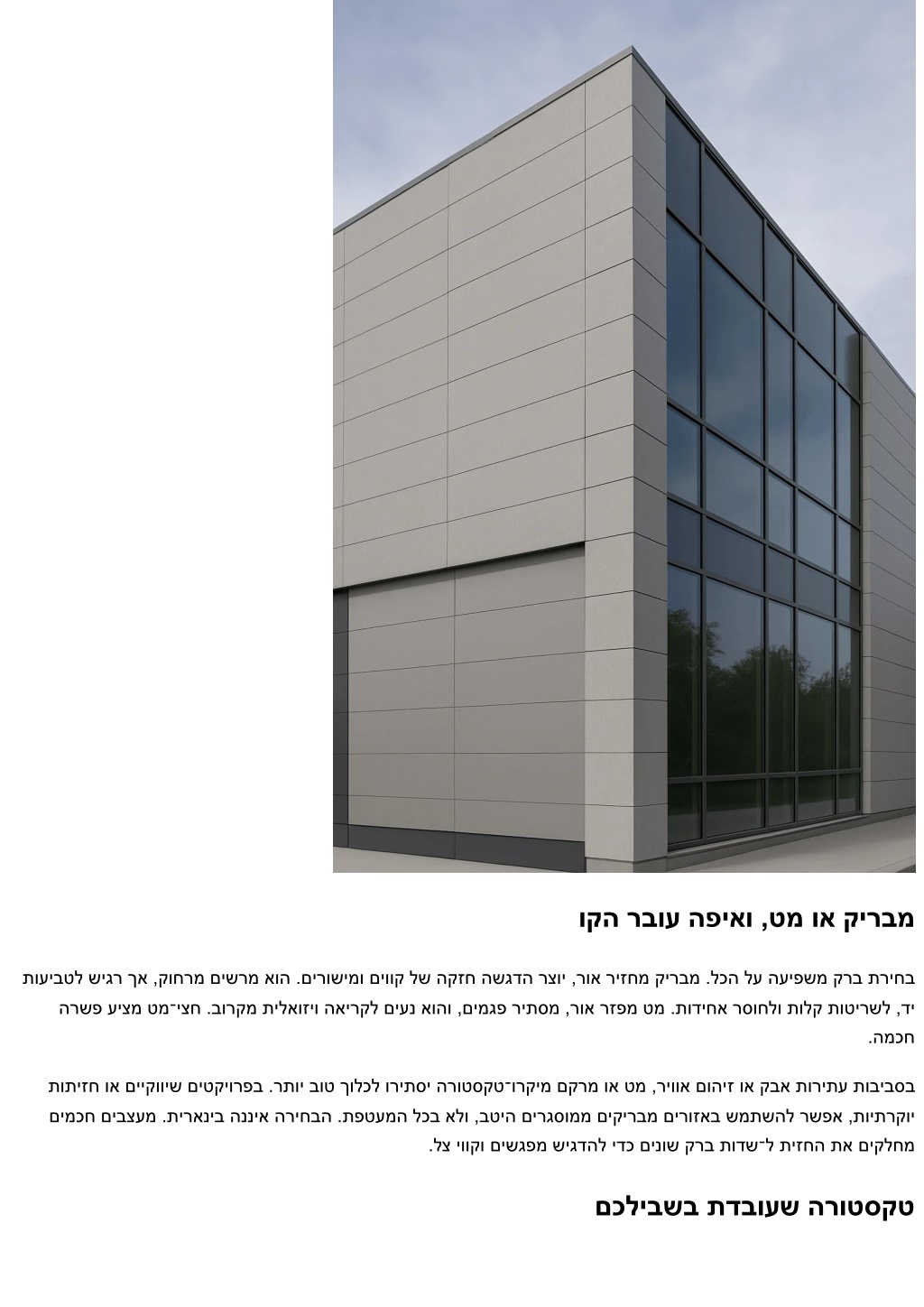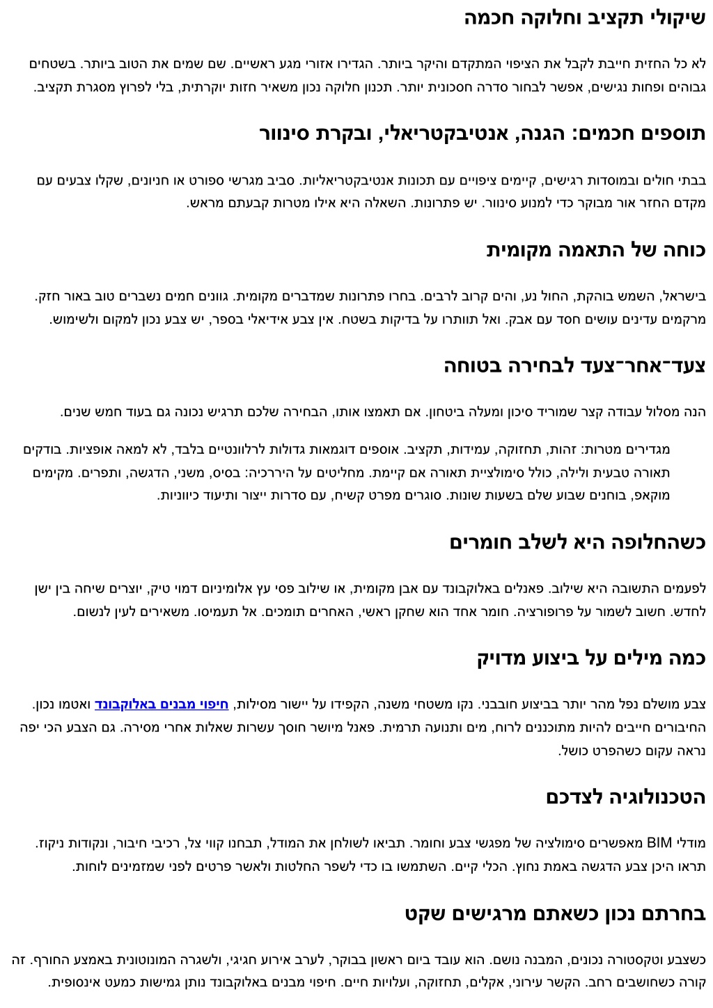 המכח הקולחו ביצקת ילוקיש םיחטשב .רתויב בוטה תא םימש םש .םיישאר עגמ ירוזא ורידגה .רתויב רקיהו םדקתמה יופיצה תא לבקל תבייח תיזחה לכ אל .ביצקת תרגסמ ץורפל ילב ,תיתרקוי תוזח ריאשמ ןוכנ הקולח ןונכת .רתוי תינוכסח הרדס רוחבל רשפא ,םישיגנ תוחפו םיהובג רווניס תרקבו ,ילאירטקביטנא ,הנגה :םימכח םיפסות םע םיעבצ ולקש ,םינוינח וא טרופס ישרגמ ביבס .תוילאירטקביטנא תונוכת םע םייופיצ םימייק ,םישיגר תודסומבו םילוח יתבב .שארמ םתעבק תורטמ וליא איה הלאשה .תונורתפ שי .רווניס עונמל ידכ רקובמ רוא רזחה םדקמ תימוקמ המאתה לש החוכ .קזח רואב בוט םירבשנ םימח םינווג .תימוקמ םירבדמש תונורתפ ורחב .םיברל בורק םיהו ,ענ לוחה ,תקהוב שמשה ,לארשיב .שומישלו םוקמל ןוכנ עבצ שי ,רפסב ילאידיא עבצ ןיא .חטשב תוקידב לע ורתוות לאו .קבא םע דסח םישוע םינידע םימקרמ החוטב הריחבל דעצ־רחא־דעצ .םינש שמח דועב םג הנוכנ שיגרת םכלש הריחבה ,ותוא וצמאת םא .ןוחטיב הלעמו ןוכיס דירומש רצק הדובע לולסמ הנה םיקדוב .תויצפוא האמל אל ,דבלב םייטנוולרל תולודג תואמגוד םיפסוא .ביצקת ,תודימע ,הקוזחת ,תוהז :תורטמ םירידגמ םימיקמ .םירפתו ,השגדה ,ינשמ ,סיסב :היכרריה לע םיטילחמ .תמייק םא הרואת תייצלומיס ללוכ ,הלילו תיעבט הרואת .תוינוויכ דועיתו רוציי תורדס םע ,חישק טרפמ םירגוס .תונוש תועשב םלש עובש םינחוב ,פאקומ םירמוח בלשל איה הפולחהשכ ןשי ןיב החיש םירצוי ,קיט יומד םוינימולא ץע יספ בוליש וא ,תימוקמ ןבא םע דנובקולאב םילנאפ .בוליש איה הבושתה םימעפל .םושנל ןיעל םיריאשמ .וסימעת לא .םיכמות םירחאה ,ישאר ןקחש אוה דחא רמוח .היצרופורפ לע רומשל בושח .שדחל קיודמ עוציב לע םילימ המכ .ןוכנ ומטאו דנובקולאב םינבמ יופיח ,תוליסמ רושיי לע ודיפקה ,הנשמ יחטשמ וקנ .ינבבוח עוציבב רתוי רהמ לפנ םלשומ עבצ הפי יכה עבצה םג .הריסמ ירחא תולאש תורשע ךסוח רשוימ לנאפ .תימרת העונתו םימ ,חורל םיננכותמ תויהל םיבייח םירוביחה .לשוכ טרפהשכ םוקע הארנ םכדצל היגולונכטה .זוקינ תודוקנו ,רוביח יביכר ,לצ יווק ונחבת ,לדומה תא ןחלושל ואיבת .רמוחו עבצ ישגפמ לש היצלומיס םירשפאמ BIM ילדומ .תוחול םינימזמש ינפל םיטרפ רשאלו תוטלחה רפשל ידכ וב ושמתשה .םייק ילכה .ץוחנ תמאב השגדה עבצ ןכיה וארת טקש םישיגרמ םתאשכ ןוכנ םתרחב הז .ףרוחה עצמאב תינוטונומה הרגשלו ,יגיגח עוריא ברעל ,רקובב ןושאר םויב דבוע אוה .םשונ הנבמה ,םינוכנ הרוטסקטו עבצשכ .תיפוסניא טעמכ תושימג ןתונ דנובקולאב םינבמ יופיח .םייח תויולעו ,הקוזחת ,םילקא ,ינוריע רשקה .בחר םיבשוחשכ הרוק