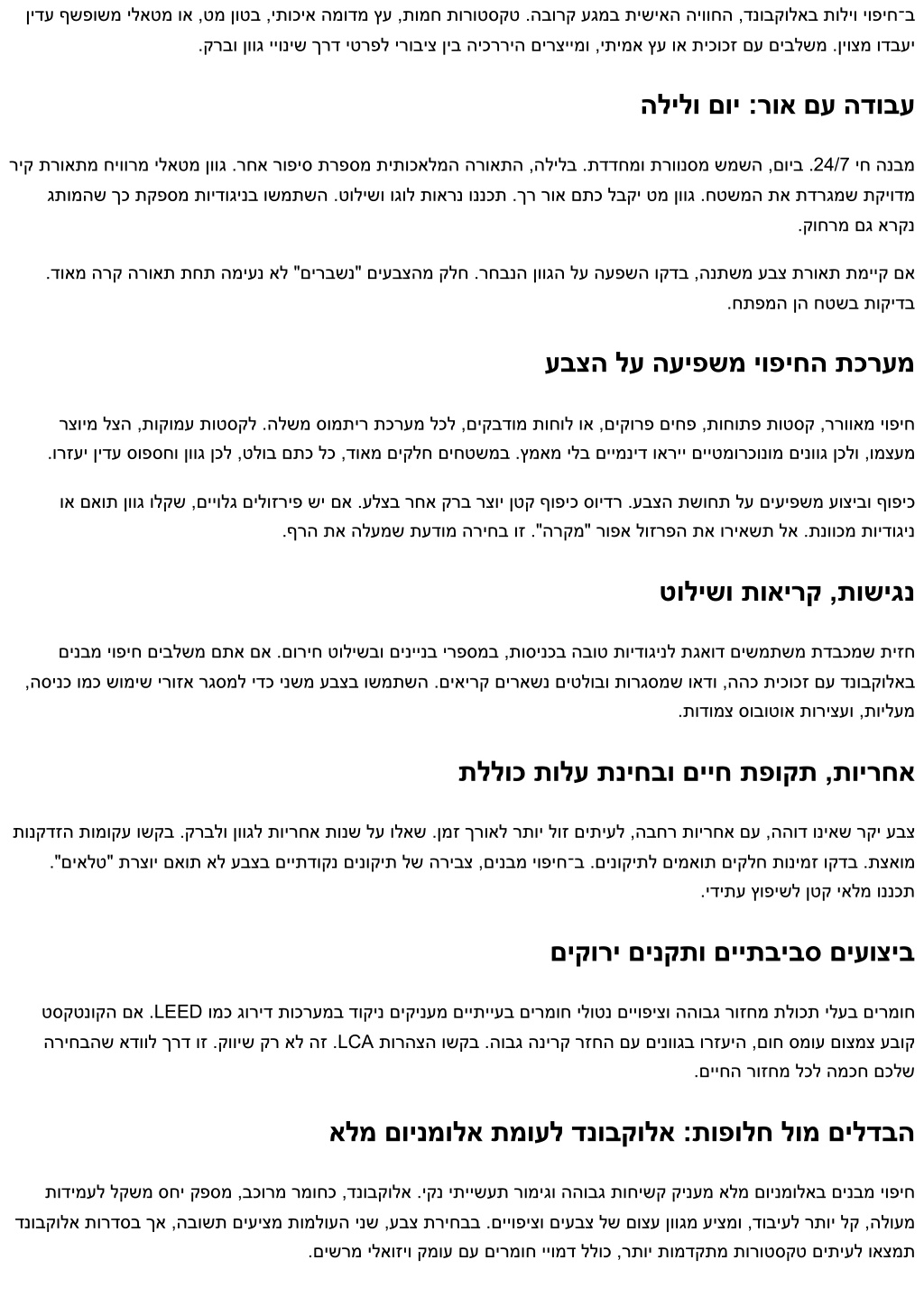 ןידע ףשפושמ ילאטמ וא ,טמ ןוטב ,יתוכיא המודמ ץע ,תומח תורוטסקט .הבורק עגמב תישיאה היווחה ,דנובקולאב תוליו יופיח־ב .קרבו ןווג ייוניש ךרד יטרפל ירוביצ ןיב היכרריה םירציימו ,יתימא ץע וא תיכוכז םע םיבלשמ .ןיוצמ ודבעי הלילו םוי :רוא םע הדובע ריק תרואתמ חיוורמ ילאטמ ןווג .רחא רופיס תרפסמ תיתוכאלמה הרואתה ,הלילב .תדדחמו תרוונסמ שמשה ,םויב .24/7 יח הנבמ גתומהש ךכ תקפסמ תוידוגינב ושמתשה .טולישו וגול תוארנ וננכת .ךר רוא םתכ לבקי טמ ןווג .חטשמה תא תדרגמש תקיודמ .קוחרמ םג ארקנ .דואמ הרק הרואת תחת המיענ אל "םירבשנ" םיעבצהמ קלח .רחבנה ןווגה לע העפשה וקדב ,הנתשמ עבצ תרואת תמייק םא .חתפמה ןה חטשב תוקידב עבצה לע העיפשמ יופיחה תכרעמ רצוימ לצה ,תוקומע תוטסקל .הלשמ סומתיר תכרעמ לכל ,םיקבדומ תוחול וא ,םיקורפ םיחפ ,תוחותפ תוטסק ,ררוואמ יופיח .ורזעי ןידע סופסחו ןווג ןכל ,טלוב םתכ לכ ,דואמ םיקלח םיחטשמב .ץמאמ ילב םיימניד ואריי םייטמורכונומ םינווג ןכלו ,ומצעמ וא םאות ןווג ולקש ,םייולג םילוזריפ שי םא .עלצב רחא קרב רצוי ןטק ףופיכ סוידר .עבצה תשוחת לע םיעיפשמ עוציבו ףופיכ .ףרה תא הלעמש תעדומ הריחב וז ."הרקמ" רופא לוזרפה תא וריאשת לא .תנווכמ תוידוגינ טולישו תואירק ,תושיגנ םינבמ יופיח םיבלשמ םתא םא .םוריח טולישבו םיניינב ירפסמב ,תוסינכב הבוט תוידוגינל תגאוד םישמתשמ תדבכמש תיזח ,הסינכ ומכ שומיש ירוזא רגסמל ידכ ינשמ עבצב ושמתשה .םיאירק םיראשנ םיטלובו תורגסמש ואדו ,ההכ תיכוכז םע דנובקולאב .תודומצ סובוטוא תוריצעו ,תוילעמ תללוכ תולע תניחבו םייח תפוקת ,תוירחא תונקדזה תומוקע ושקב .קרבלו ןווגל תוירחא תונש לע ולאש .ןמז ךרואל רתוי לוז םיתיעל ,הבחר תוירחא םע ,ההוד וניאש רקי עבצ ."םיאלט" תרצוי םאות אל עבצב םייתדוקנ םינוקית לש הריבצ ,םינבמ יופיח־ב .םינוקיתל םימאות םיקלח תונימז וקדב .תצאומ .ידיתע ץופישל ןטק יאלמ וננכת םיקורי םינקתו םייתביבס םיעוציב טסקטנוקה םא .LEED ומכ גוריד תוכרעמב דוקינ םיקינעמ םייתייעב םירמוח ילוטנ םייופיצו ההובג רוזחמ תלוכת ילעב םירמוח הריחבהש אדוול ךרד וז .קוויש קר אל הז .LCA תורהצה ושקב .הובג הנירק רזחה םע םינווגב ורזעיה ,םוח סמוע םוצמצ עבוק .םייחה רוזחמ לכל המכח םכלש אלמ םוינמולא תמועל דנובקולא :תופולח לומ םילדבה תודימעל לקשמ סחי קפסמ ,בכורמ רמוחכ ,דנובקולא .יקנ יתיישעת רומיגו ההובג תוחישק קינעמ אלמ םוינמולאב םינבמ יופיח דנובקולא תורדסב ךא ,הבושת םיעיצמ תומלועה ינש ,עבצ תריחבב .םייופיצו םיעבצ לש םוצע ןווגמ עיצמו ,דוביעל רתוי לק ,הלועמ .םישרמ ילאוזיו קמוע םע םירמוח ייומד ללוכ ,רתוי תומדקתמ תורוטסקט םיתיעל ואצמת