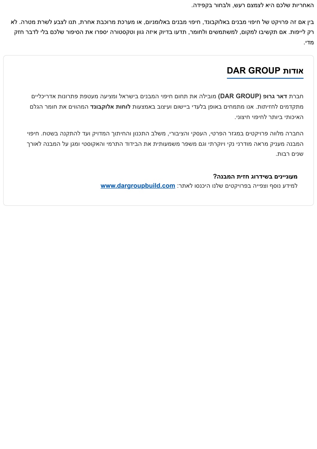 .הדיפקב רוחבלו ,שער םצמצל איה םכלש תוירחאה אל .הרטמ תרשל עבצל ונת ,תרחא תבכורמ תכרעמ וא ,םוינמולאב םינבמ יופיח ,דנובקולאב םינבמ יופיח לש טקיורפ הז םא ןיב קזח רבדל ילב םכלש רופיסה תא ורפסי הרוטסקטו ןווג הזיא קוידב ועדת ,רמוחלו םישמתשמל ,םוקמל ובישקת םא .תופייל קר .ידמ DAR GROUP תודוא םיילכירדא תונורתפ תפטעמ העיצמו לארשיב םינבמה יופיח םוחת תא הליבומ (DAR GROUP) פורג ראד תרבח םלגה רמוח תא םיווהמה דנובקולא תוחול תועצמאב בוציעו םושייב ידעלב ןפואב םיחמתמ ונא .תותיזחל םימדקתמ .ינוציח יופיחל רתויב יתוכיאה יופיח .חטשב הנקתהל דעו קיודמה ךותיחהו ןונכתה בלשמ ,ירוביצהו יקסעה ,יטרפה רזגמב םיטקיורפ הוולמ הרבחה ךרואל הנבמה לע ןגמו יטסוקאהו ימרתה דודיבה תא תיתועמשמ רפשמ םגו יתרקויו יקנ ינרדומ הארמ קינעמ הנבמה .תובר םינש ?הנבמה תיזח גורדישב םיניינועמ www.dargroupbuild.com :רתאל וסנכיה ונלש םיטקיורפב הייפצו ףסונ עדימל