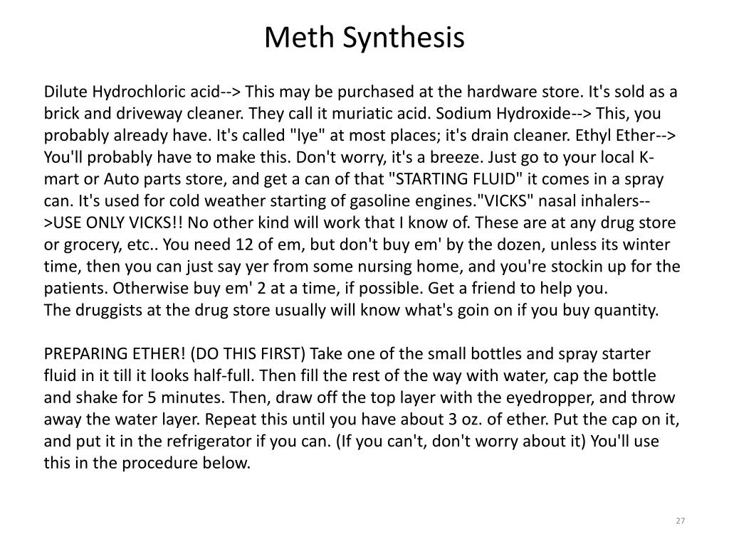 Meth Synthesis Dilute Hydrochloric acid--> This may be purchased at the hardware store. It's sold as a brick and driveway cleaner. They call it muriatic acid. Sodium Hydroxide--> This, you probably already have. It's called "lye" at most places; it's drain cleaner. Ethyl Ether--> You'll probably have to make this. Don't worry, it's a breeze. Just go to your local K-mart or Auto parts store, and get a can of that "STARTING FLUID" it comes in a spray can. It's used for cold weather starting of gasoline engines."VICKS" nasal inhalers-->USE ONLY VICKS!! No other kind will work that I know of. These are at any drug store or grocery, etc.. You need 12 of em, but don't buy em' by the dozen, unless its winter time, then you can just say yer from some nursing home, and you're stockin up for the patients. Otherwise buy em' 2 at a time, if possible. Get a friend to help you. The druggists at the drug store usually will know what's goin on if you buy quantity. PREPARING ETHER! (DO THIS FIRST) Take one of the small bottles and spray starter fluid in it till it looks half-full. Then fill the rest of the way with water, cap the bottle and shake for 5 minutes. Then, draw off the top layer with the eyedropper, and throw away the water layer. Repeat this until you have about 3 oz. of ether. Put the cap on it, and put it in the refrigerator if you can. (If you can't, don't worry about it) You'll use this in the procedure below.