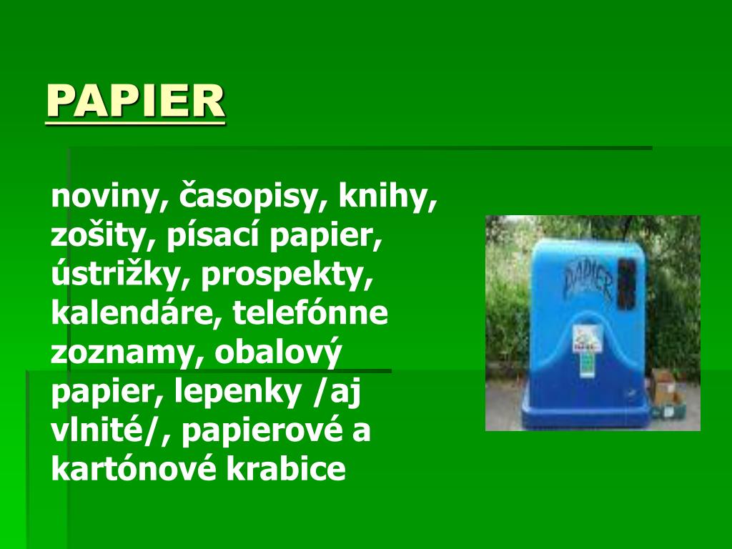 PAPIER noviny, časopisy, knihy, zošity, písací papier, ústrižky, prospekty, kalendáre, telefónne zoznamy, obalový papier, lepenky /aj vlnité/, papierové a kartónové krabice