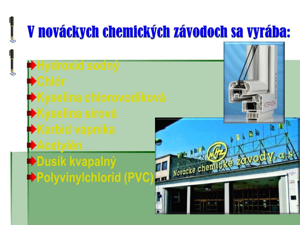 V nováckych chemických závodoch sa vyrába: • Hydroxid sodný • Chlór • Kyselina chlorovodíková • Kyselina sírová • Karbid vápnika • Acetylén • Dusík kvapalný • Polyvinylchlorid (PVC)