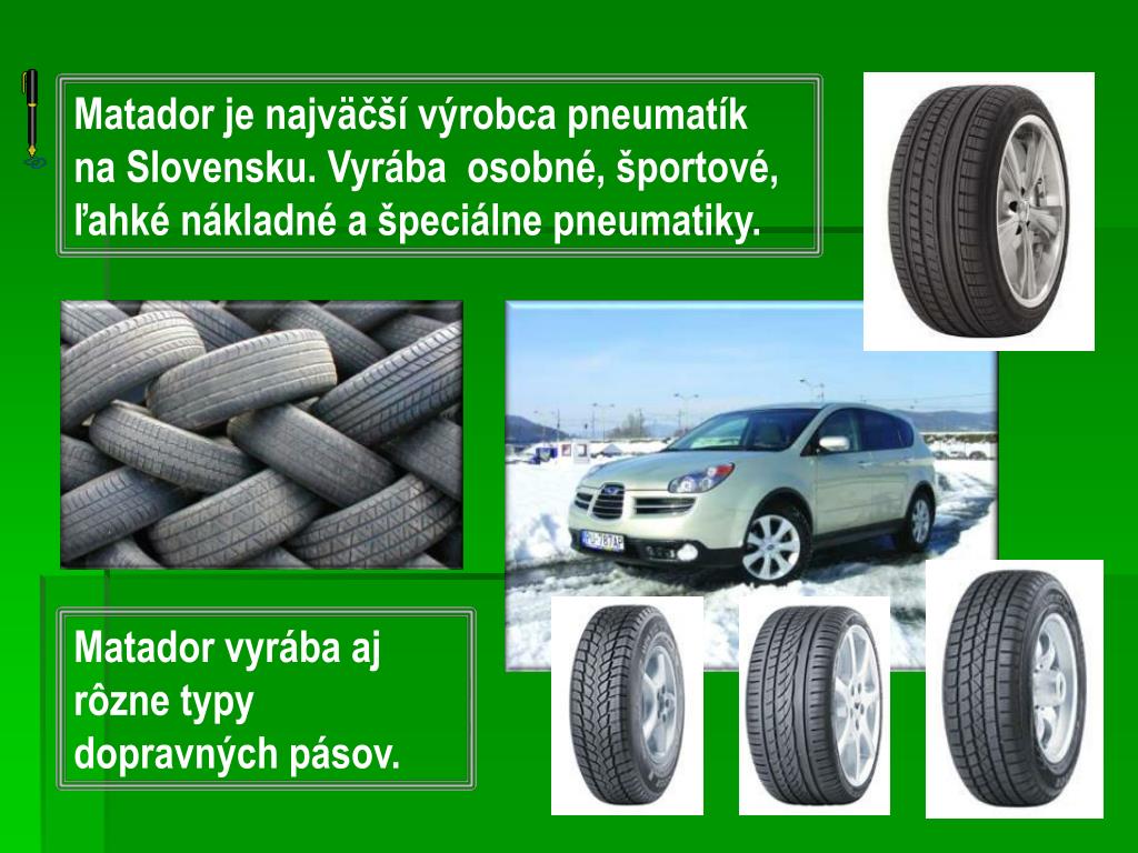 Matador je najväčší výrobca pneumatík na Slovensku. Vyrába osobné, športové, ľahké nákladné a špeciálne pneumatiky. Matador vyrába aj rôzne typy dopravných pásov.