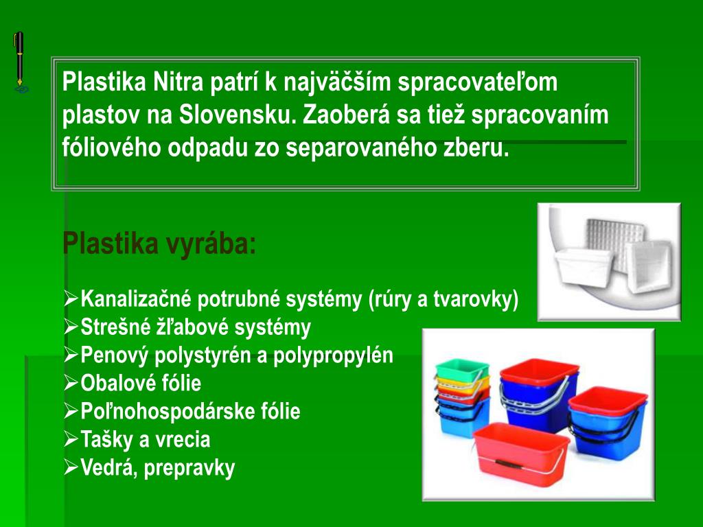 Plastika Nitra patrí k najväčším spracovateľom plastov na Slovensku. Zaoberá sa tiež spracovaním fóliového odpadu zo separovaného zberu. Plastika vyrába: • Kanalizačné potrubné systémy (rúry a tvarovky) • Strešné žľabové systémy • Penový polystyrén a polypropylén • Obalové fólie • Poľnohospodárske fólie • Tašky a vrecia • Vedrá, prepravky