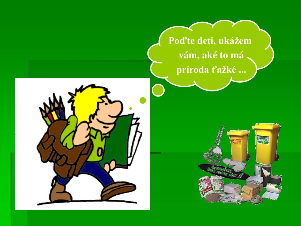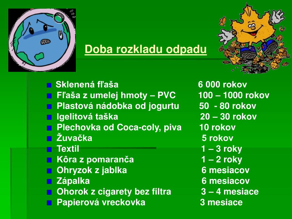 Doba rozkladu odpadu • Sklenená fľaša 6 000 rokov • Fľaša z umelej hmoty – PVC 100 – 1000 rokov • Plastová nádobka od jogurtu 50 - 80 rokov • Igelitová taška 20 – 30 rokov • Plechovka od Coca-coly, piva 10 rokov • Žuvačka 5 rokov • Textil 1 – 3 roky • Kôra z pomaranča 1 – 2 roky • Ohryzok z jablka 6 mesiacov • Zápalka 6 mesiacov • Ohorok z cigarety bez filtra 3 – 4 mesiace • Papierová vreckovka 3 mesiace