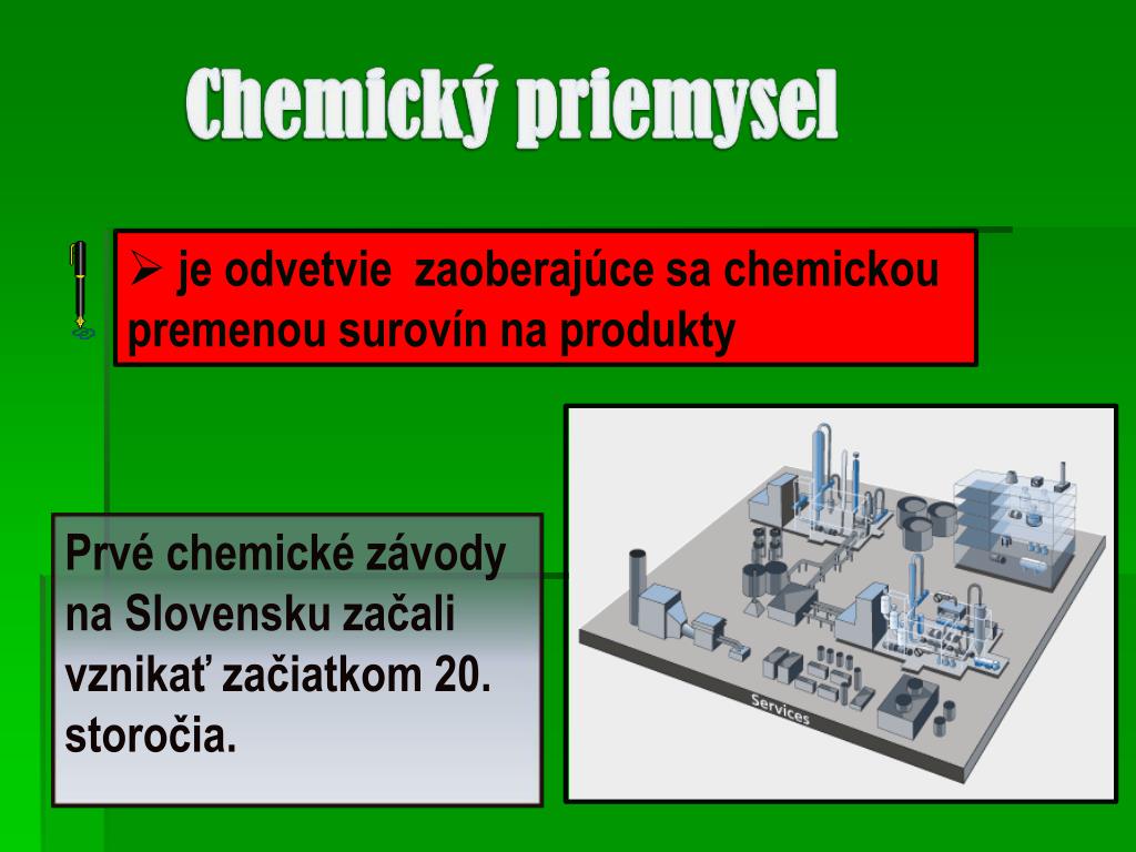 Prvé chemické závody na Slovensku začali vznikať začiatkom 20. storočia. • je odvetvie zaoberajúce sa chemickou premenou surovín na produkty