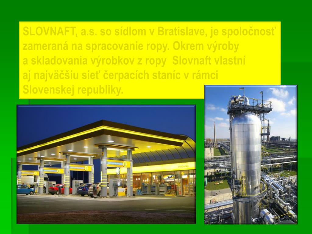 SLOVNAFT, a.s. so sídlom v Bratislave, je spoločnosť zameraná na spracovanie ropy. Okrem výroby a skladovania výrobkov z ropy Slovnaft vlastní aj najväčšiu sieť čerpacích staníc v rámci Slovenskej republiky.