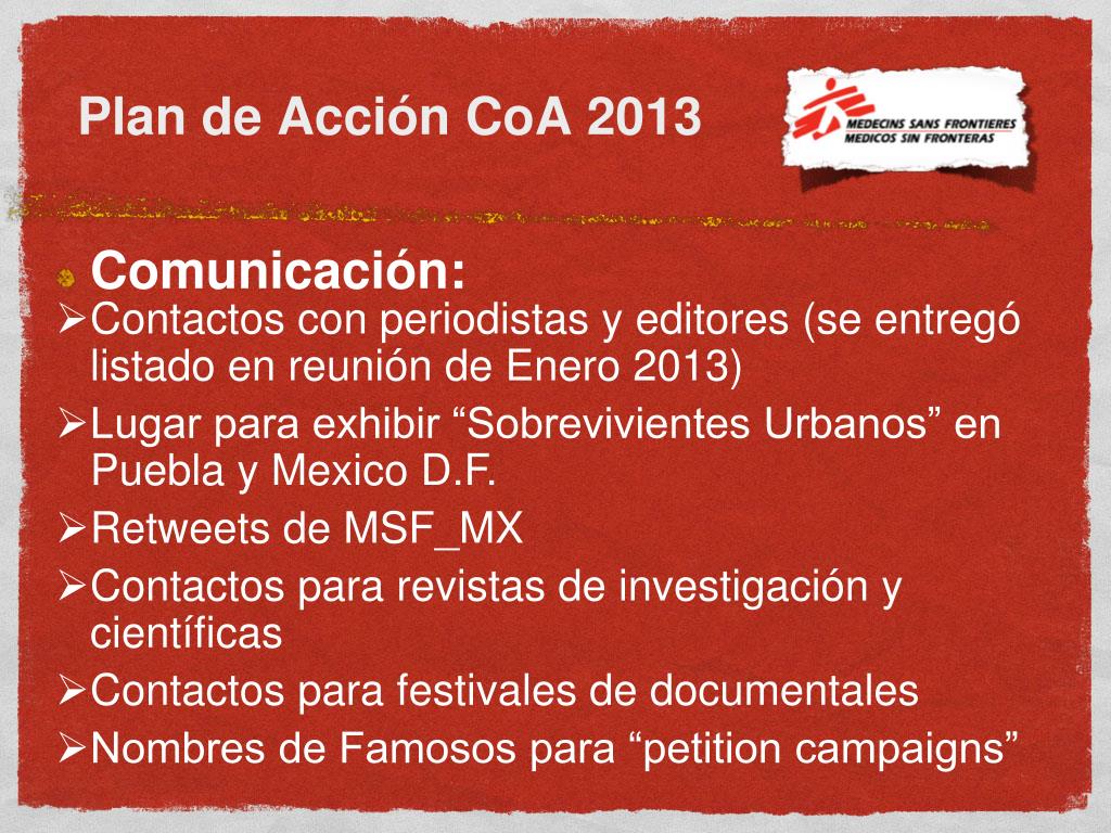 Plan de Acción CoA 2013 • Comunicación: • Contactos con periodistas y editores (se entregó listado en reunión de Enero 2013) • Lugar para exhibir “Sobrevivientes Urbanos” en Puebla y Mexico D.F. • Retweets de MSF_MX • Contactos para revistas de investigación y científicas • Contactos para festivales de documentales • Nombres de Famosos para “petition campaigns”