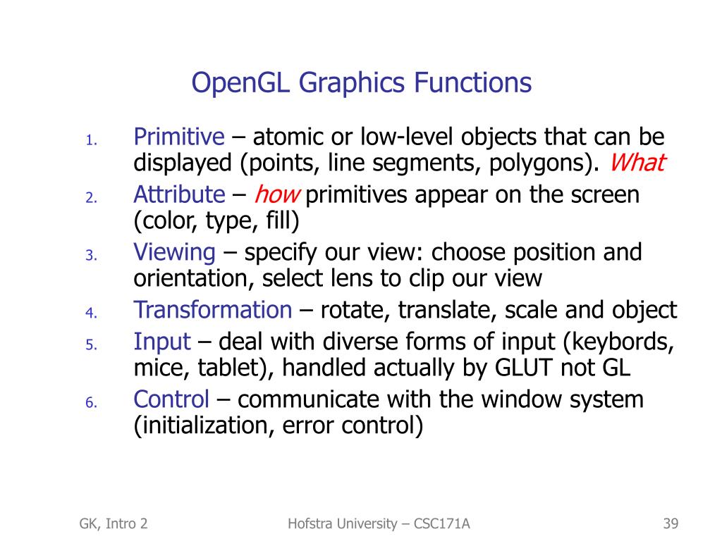 OpenGL Interface • Function names begin with gl glColor3f() • Libraries:GLU – Graphics Utility LibraryGLUT – GL Utility ToolkitGLX – X-Windows Extension • Include Files:#include <GL/glut.h> Hofstra University – CSC171A