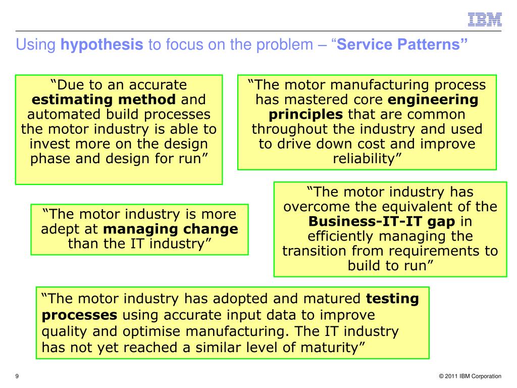 Using hypothesis to focus on the problem – “Service Patterns” “Due to an accurate estimating method and automated build processes the motor industry is able to invest more on the design phase and design for run” “The motor manufacturing process has mastered core engineering principles that are common throughout the industry and used to drive down cost and improve reliability” “The motor industry has overcome the equivalent of the Business-IT-IT gap in efficiently managing the transition from requirements to build to run” “The motor industry is more adept at managing change than the IT industry” “The motor industry has adopted and matured testing processes using accurate input data to improve quality and optimise manufacturing. The IT industry has not yet reached a similar level of maturity”