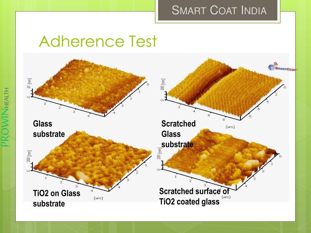 Characteristics of Smartcoat • Nano-sized Titanium Dioxide (2-3 nm) • Transparent- easy to apply to any surface due to Dispersion Technology • Visible Light Response and Reaction • SELF Binding Capabilities without any binder • Spraying and Fixing Directly • Getting Dry and Firm Instantly