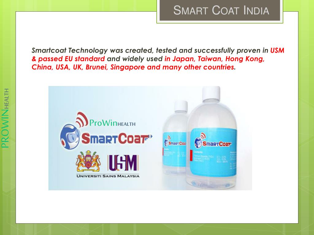Smartcoat Technology was created, tested and successfully proven in USM & passed EU standard and widely used in Japan, Taiwan, Hong Kong, China, USA, UK, Brunei, Singapore and many other countries. ProWinHEALTH
