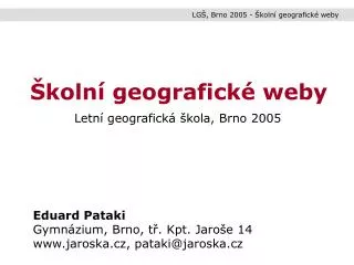 LGŠ, Brno 2005 - Školní geografické weby Školní geografické weby Letní geografická škola, Brno 2005 Eduard Pataki Gymnázium, Brno, tř. Kpt. Jaroše 14 www.jaroska.cz, pataki@jaroska.cz