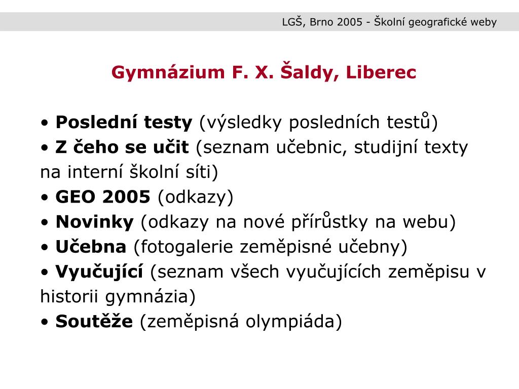 LGŠ, Brno 2005 - Školní geografické weby • Gymnázium F. X. Šaldy, Liberec • Poslední testy (výsledky posledních testů) • Z čeho se učit (seznam učebnic, studijní texty na interní školní síti) • GEO 2005 (odkazy) • Novinky (odkazy na nové přírůstky na webu) • Učebna (fotogalerie zeměpisné učebny) • Vyučující (seznam všech vyučujících zeměpisu v historii gymnázia) • Soutěže (zeměpisná olympiáda)